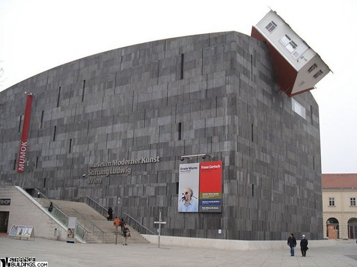 Ngôi nhà Tấn công (Áo). Bảo tàng Moderner Kunst được thiết kế bởi nghệ sỹ Erwin Wurm và là bảo tàng mỹ thuật lớn nhất nước Áo, với hình ảnh một ngôi nhà nhỏ lao vào mái tòa nhà.